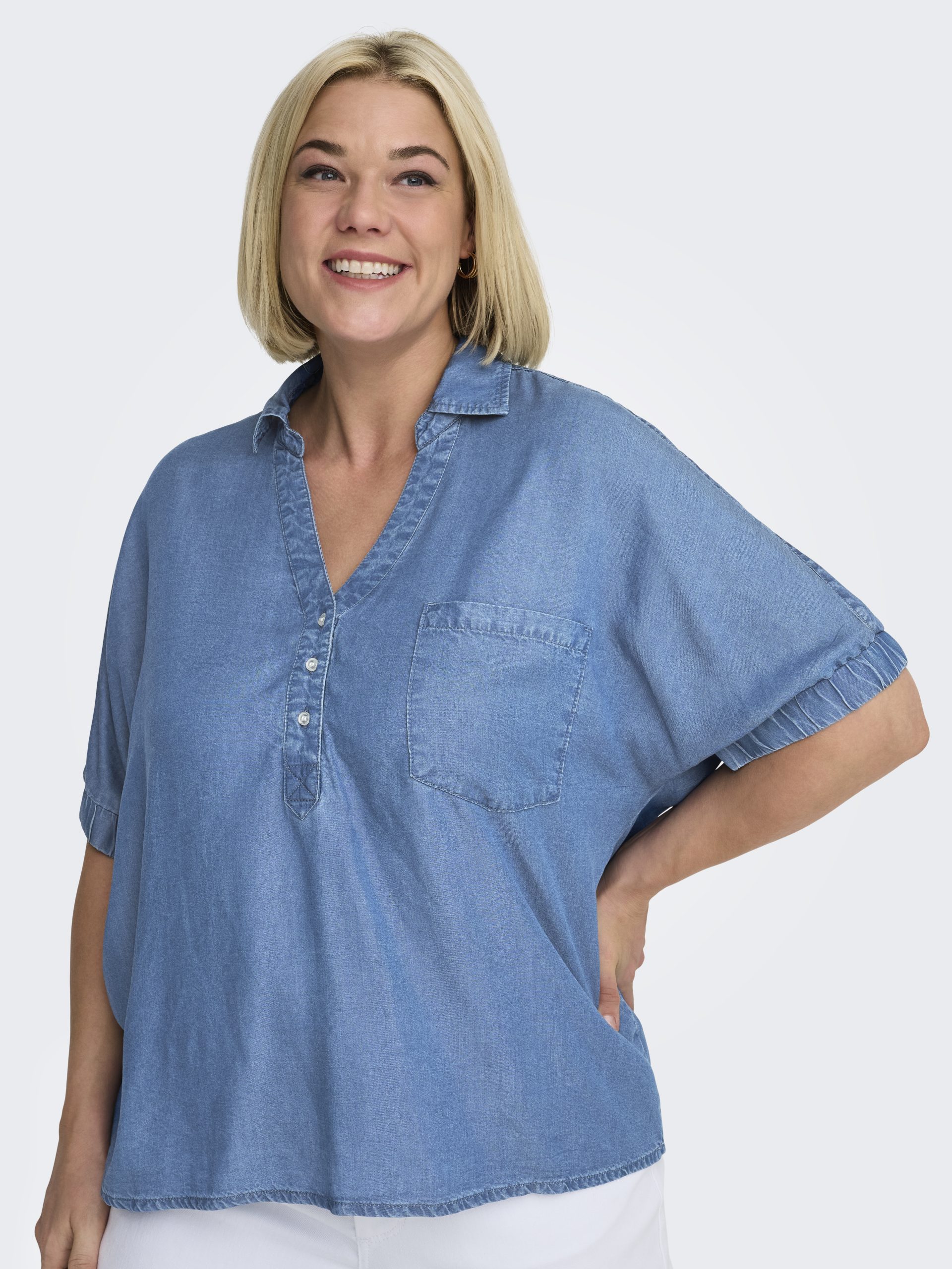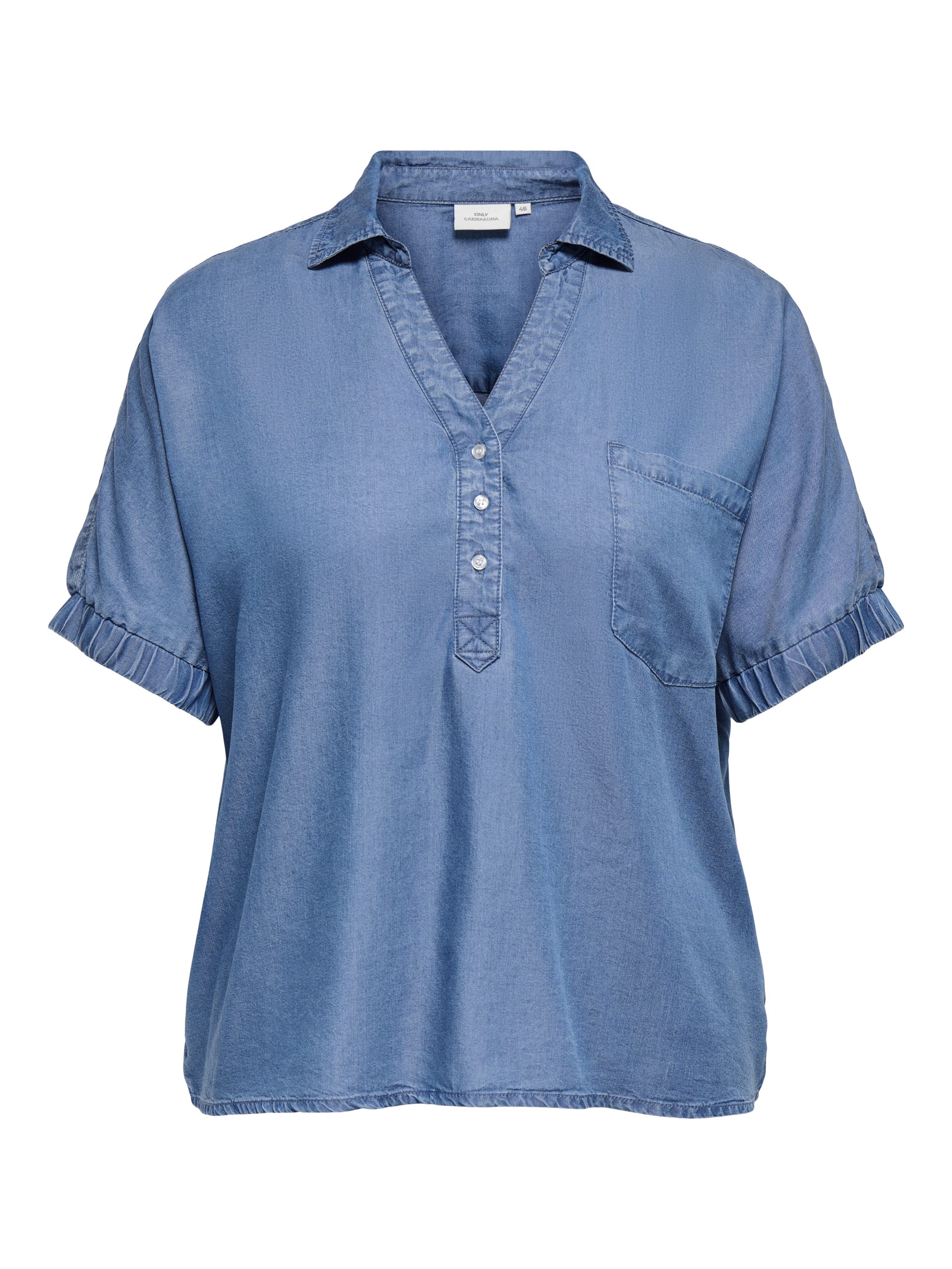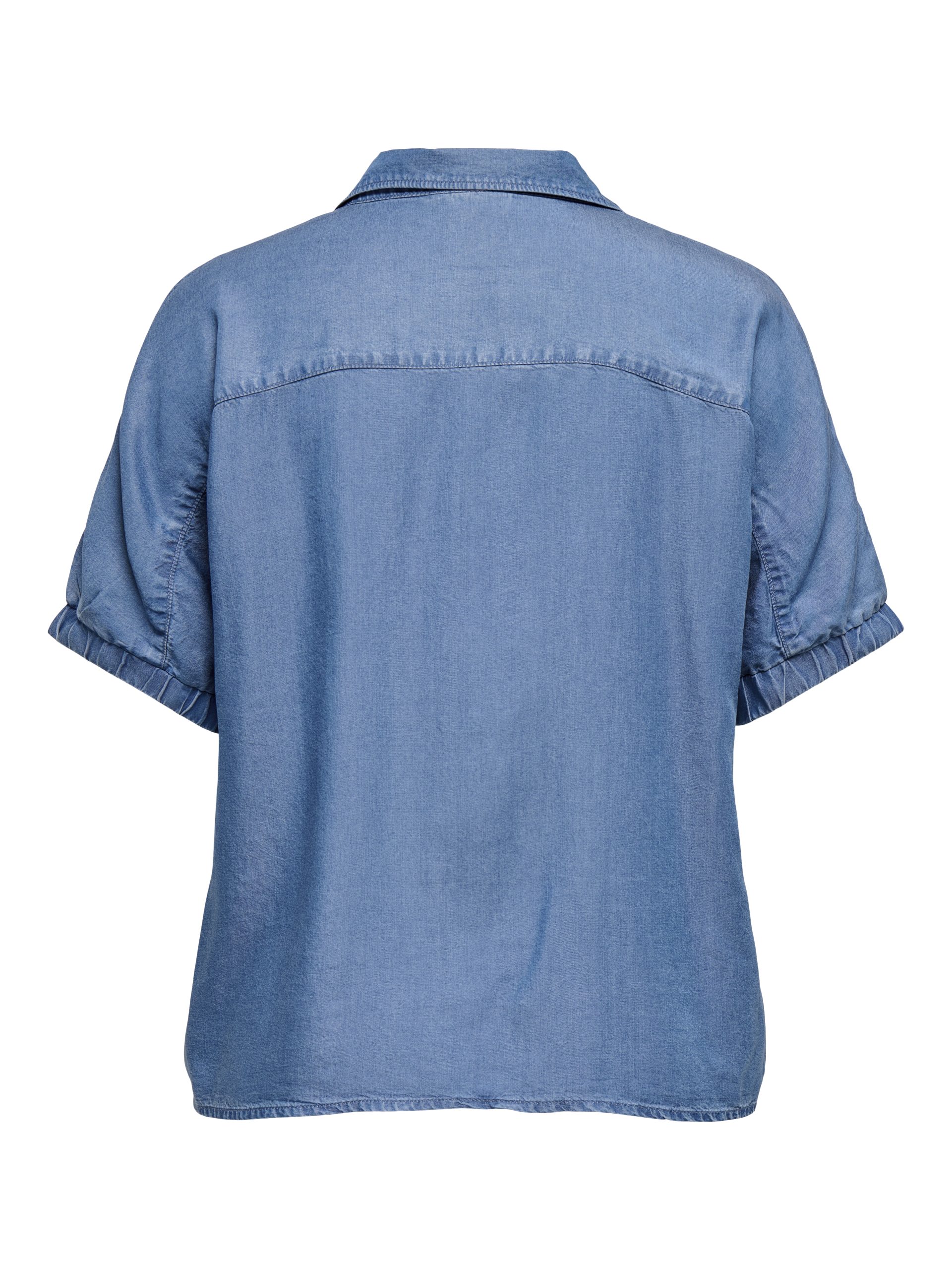 En skjorta/blus i ett mjukt och behagligt material som påminner om denim. Lätt att kombinera med andra plagg och passar lika bra till vardags som till mer uppklädda tillfällen.