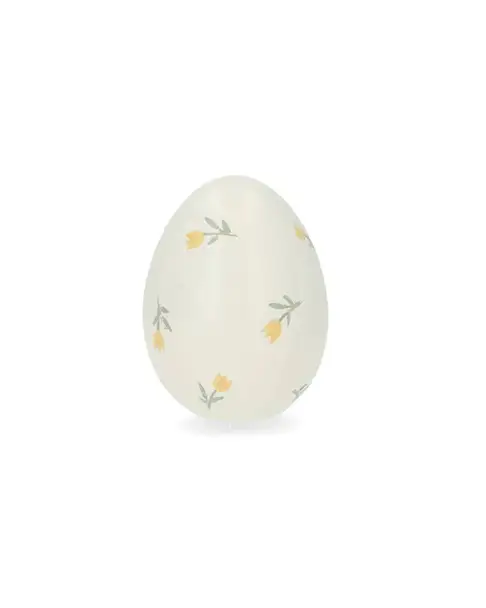 Ett ljuvligt ägg med små gula tulpaner på, en fin dekoration både på det dukade bordet eller i fönstret.