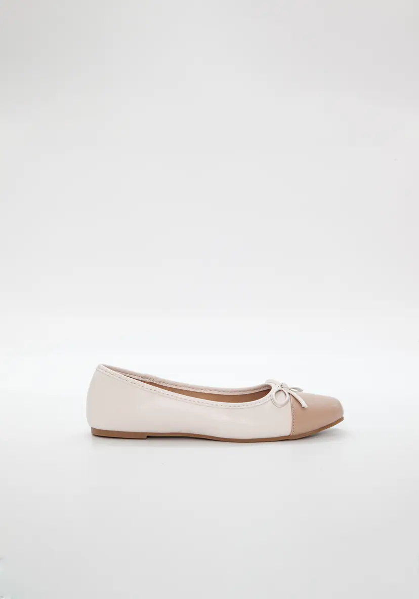 En klassisk ballerinasko med rundad tå och rosett framtill.