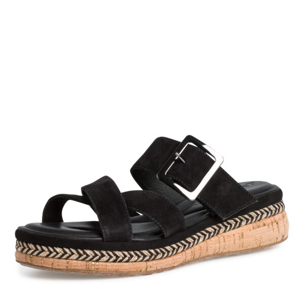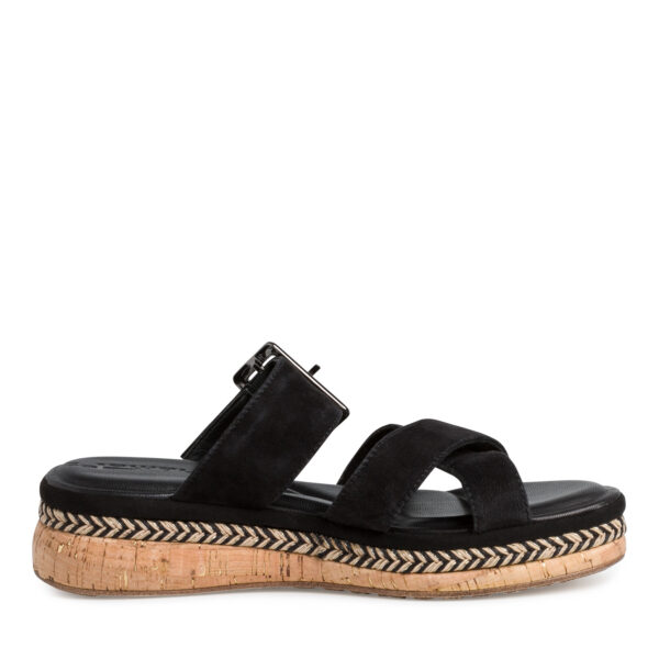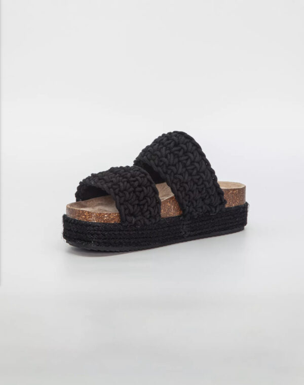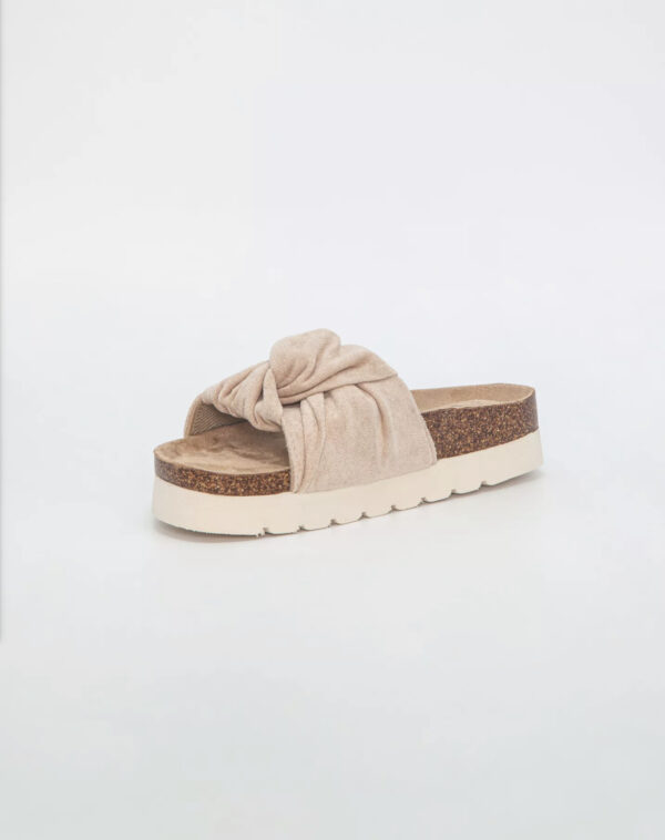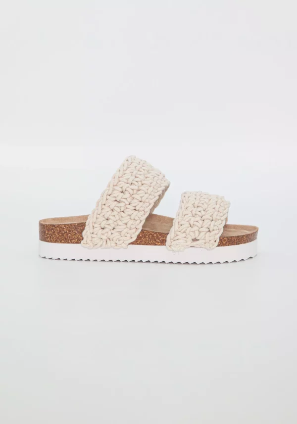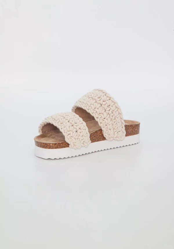 Mysiga tofflor i fuskpäls med korsade remmar.