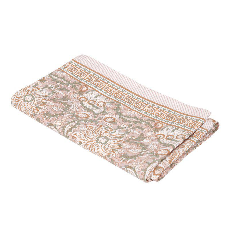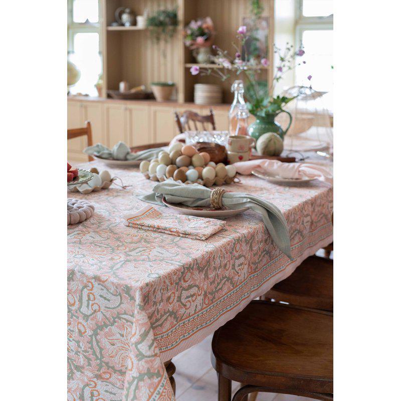 Duk i 100% återvunnen bomull med ett magnifikt mönster och med en vacker bård längs långsidorna i härliga färger, som skapar en inbjudande och ombonad känsla vid varje måltid.