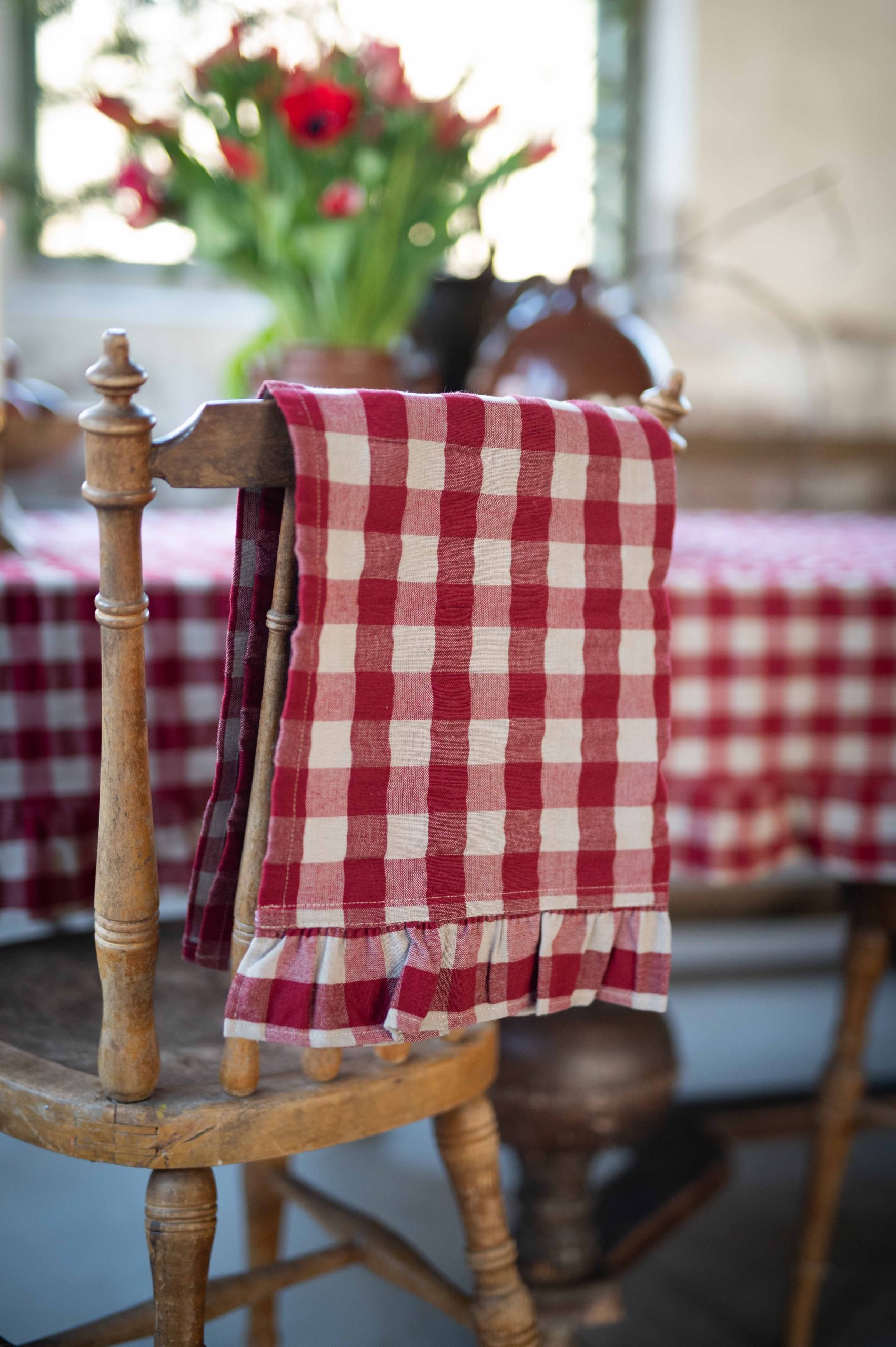 Stor duk i bäckebölja med vacker volang med ett klassiskt rutmönster är en elegant och inbjudande detalj för ditt matbord.