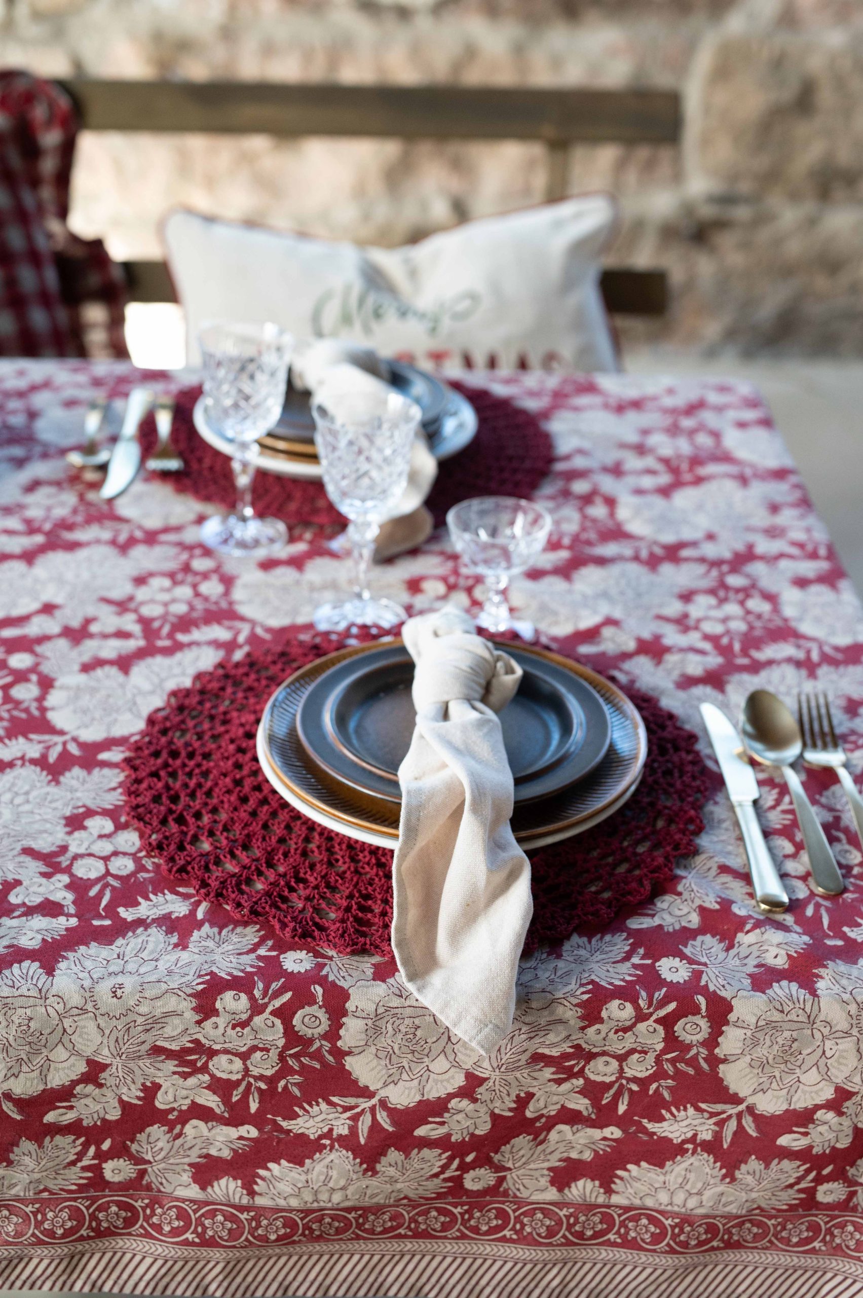 Stor härlig duk med blommigt mönster och en bård runt om.