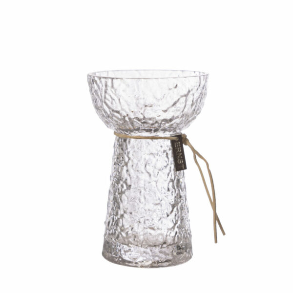 Hyacintvas i glas med små bubblor, vasen har det klassiska läderbandet med ERNST logga.