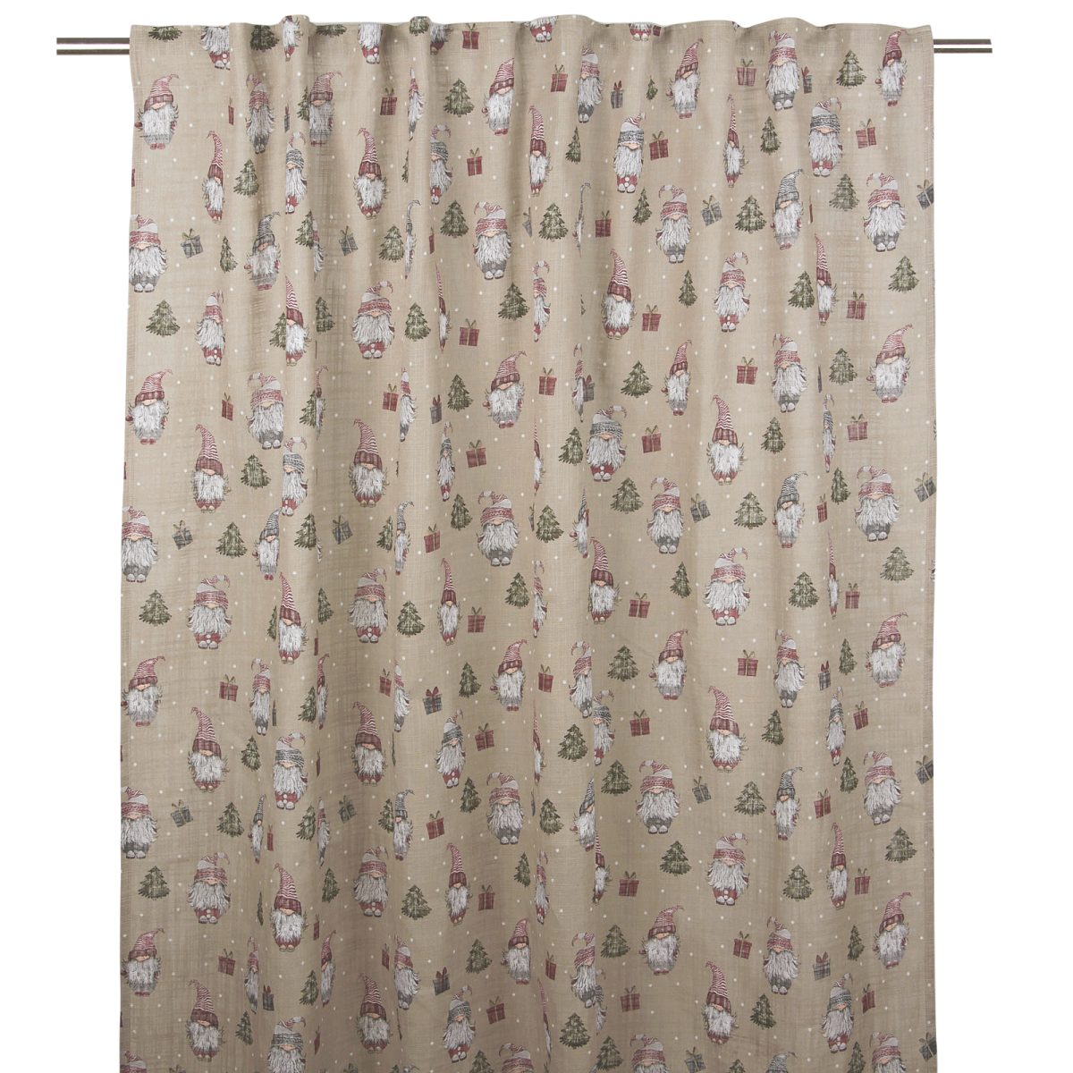 Gardinlängder med tomtar och granar.