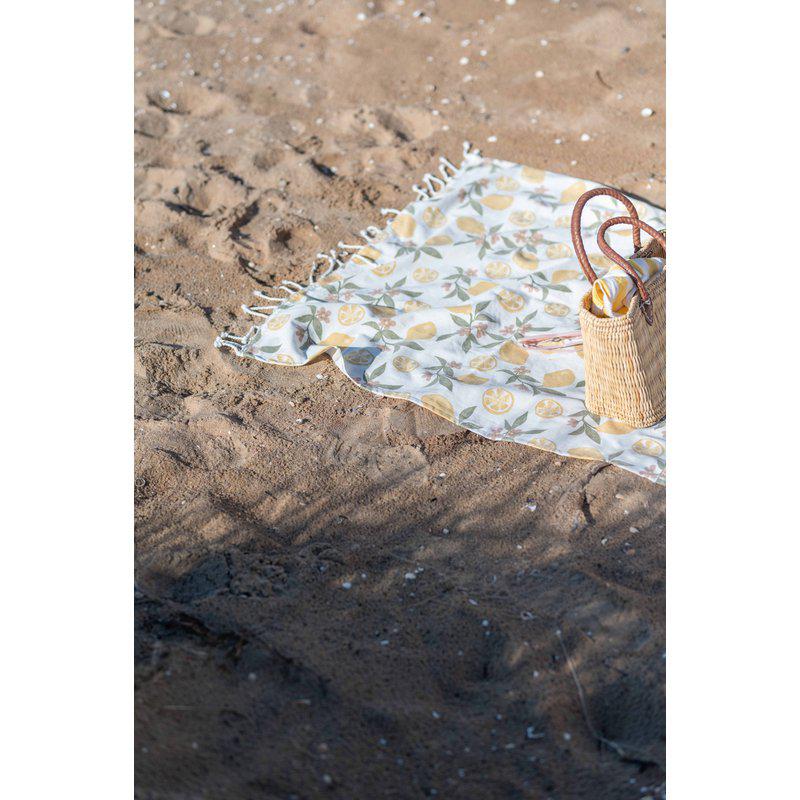 Hamamhandduk tillverkad av återvunnen bomull och polyester, prydd med ett ljuvligt sommarmönster som för tankarna till Medelhavets soliga stränder.