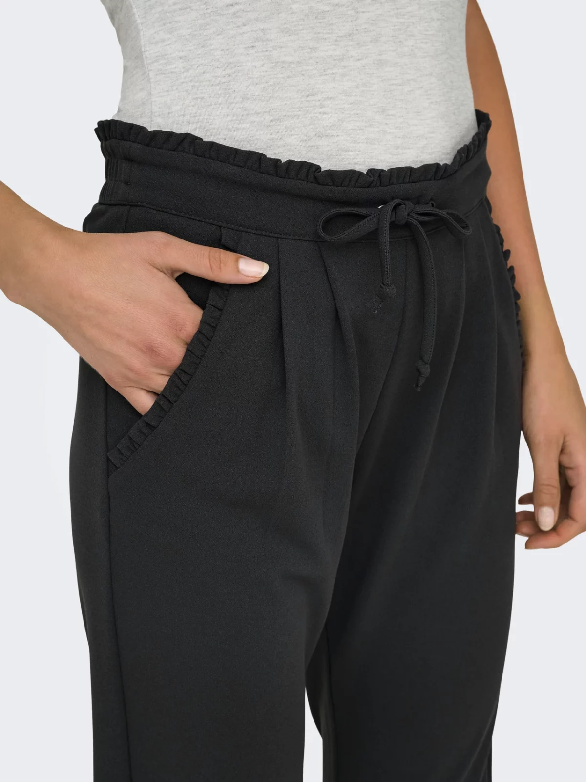 Sköna byxor med söta volangdetaljer upptill och vid fram fickorna.