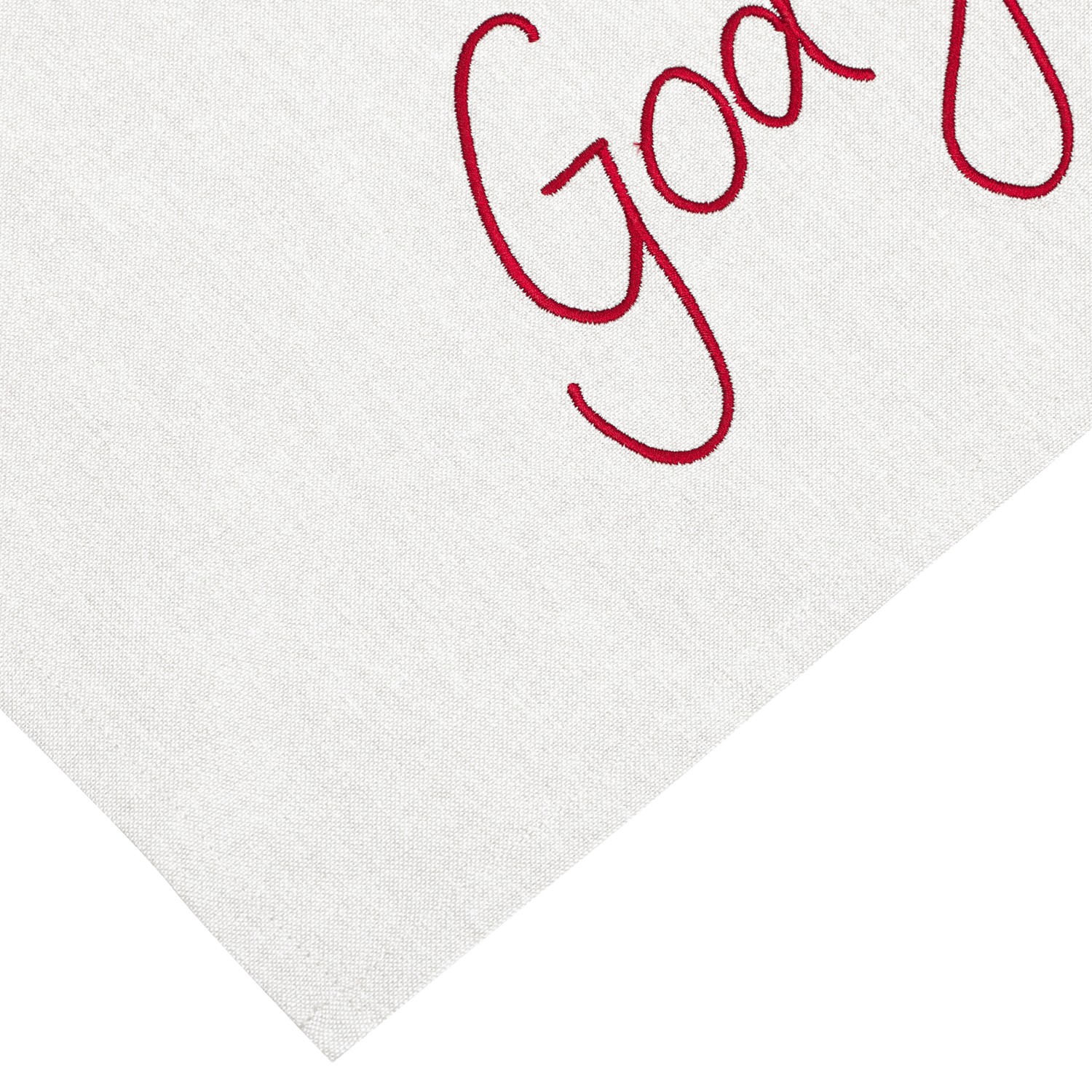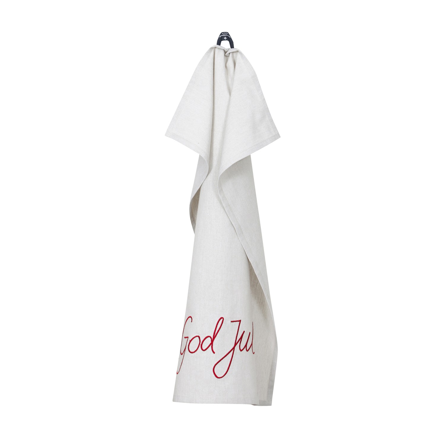 Enfärgad kökshandduk i en snygg beige färg som har texten God Jul broderad.
