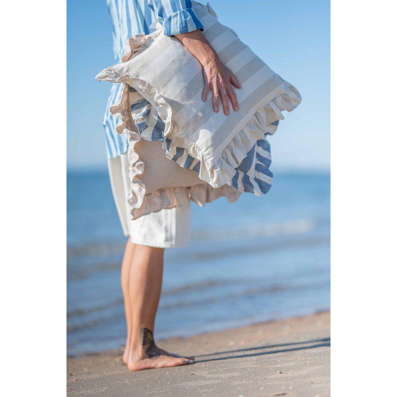 Kuddfodral i fin blockrand med en volangkant runtomkring, tillverkat av en miljövänlig blandning av återvunna material.