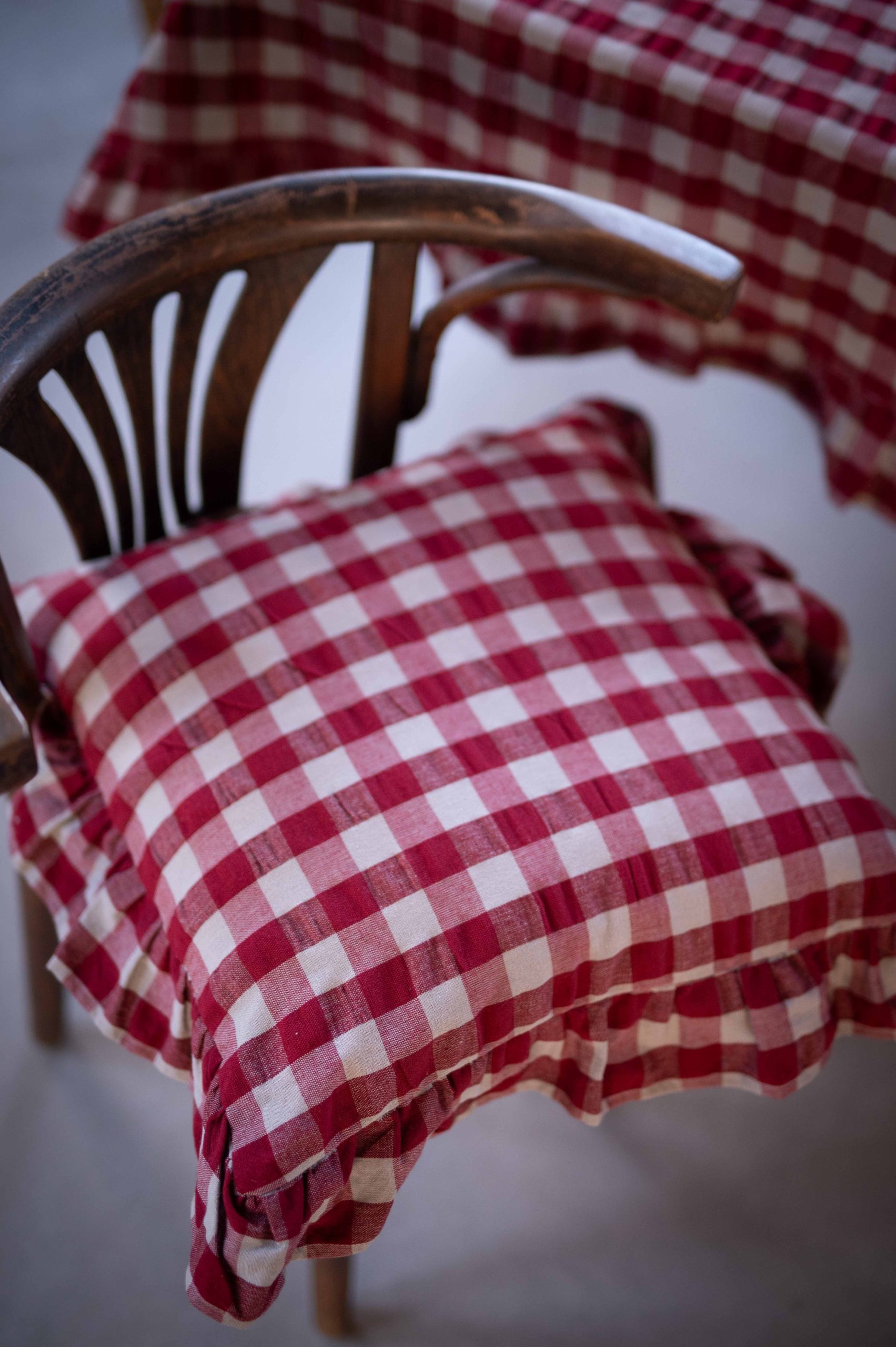 Kuddfodral i bäckebölja med klassiskt rutmönster är en charmig och stilfull detalj i ditt hem. Den eleganta volangen längs kanterna ger en extra touch av romantik, vilket mjukar upp det klassiska utseendet och skapar en inbjudande känsla.