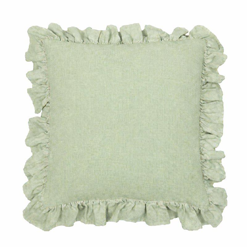 Kuddfodral med volang runtom tillverkad av en blandning av återvunnen bomull och återvunnen polyester, vilket gör den till ett mer hållbart val.