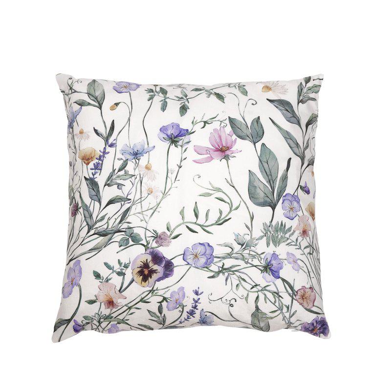 Kuddfodral tillverkat i mjuk, fin sammet som har ett elegant blommönster med violer på som ger en romantisk och klassisk känsla.