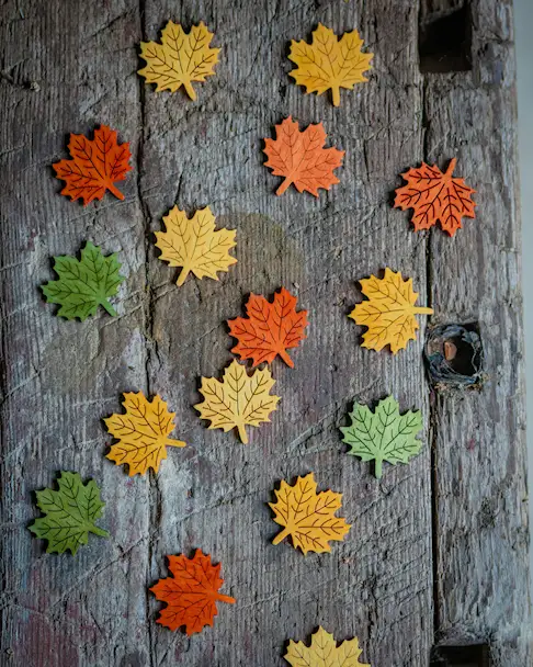 Dekorativa lönnlöv som kan användas i ett blomsterarrangemang eller som dekoration vid dukningen.