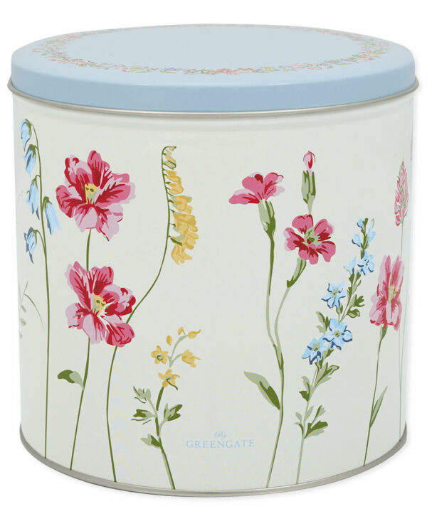 Plåtburk med romantiskt blom-mönster i härliga sommar färger.