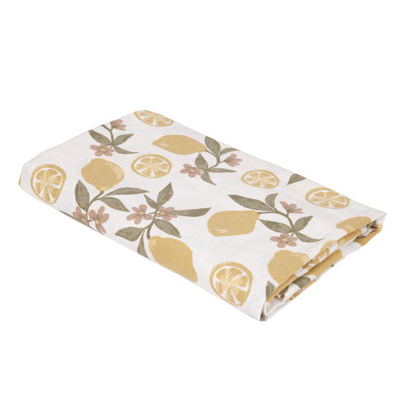 En akrylatbehandlad metervara med ett tryckt citronmönster på, tillverkad av bomull.