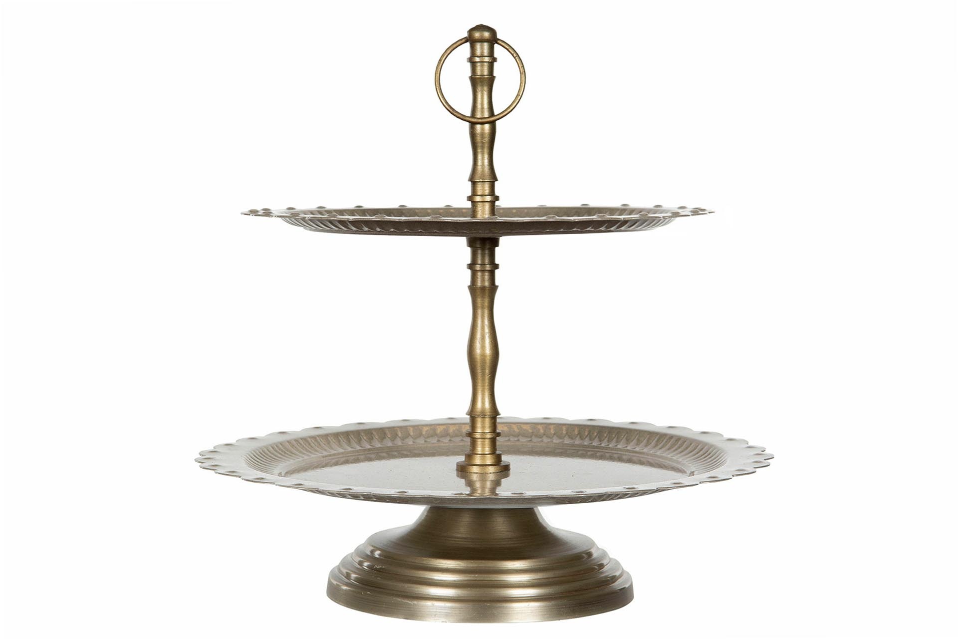 Våningsfat med två nivåer i emalj och ett handtag upptill i borstad mässing.