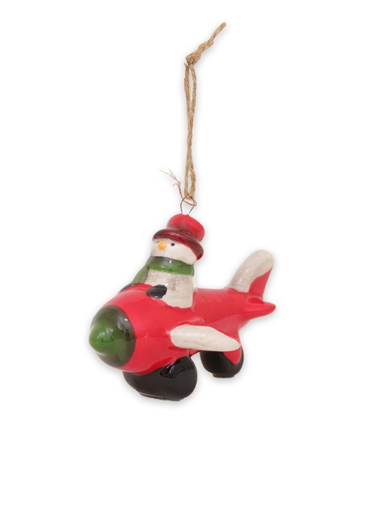 Hängande flygplan med en snögubbe som pilot, lika fin i granen som i fönstret.