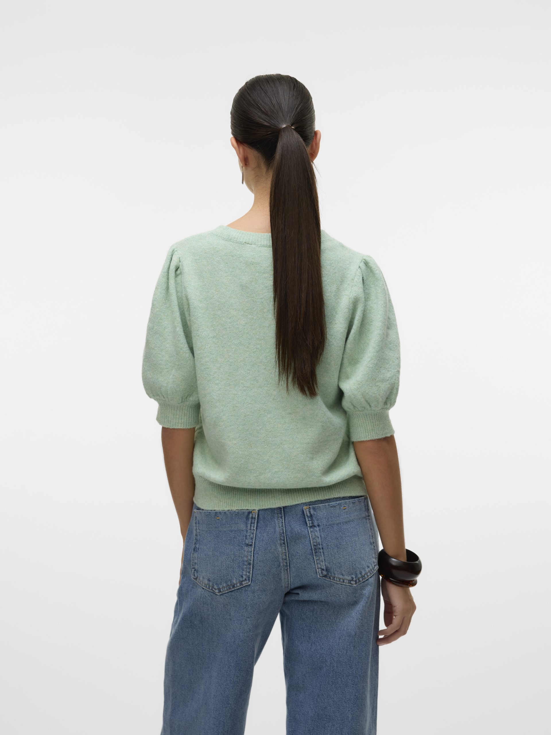 Stickad tröja i mjukt och härligt material med en kort ärm som också har en lätt liten puff på axeln.
